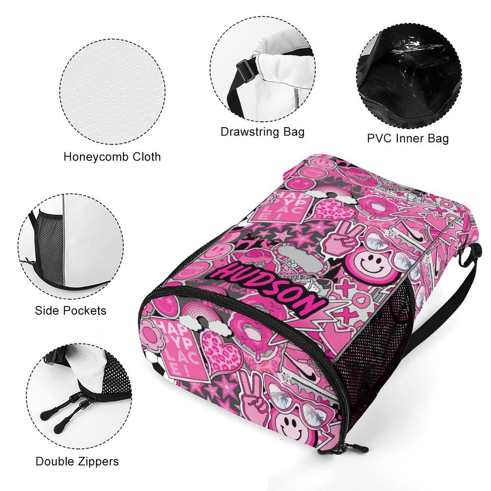 - Drawstring closure and adjustable straps